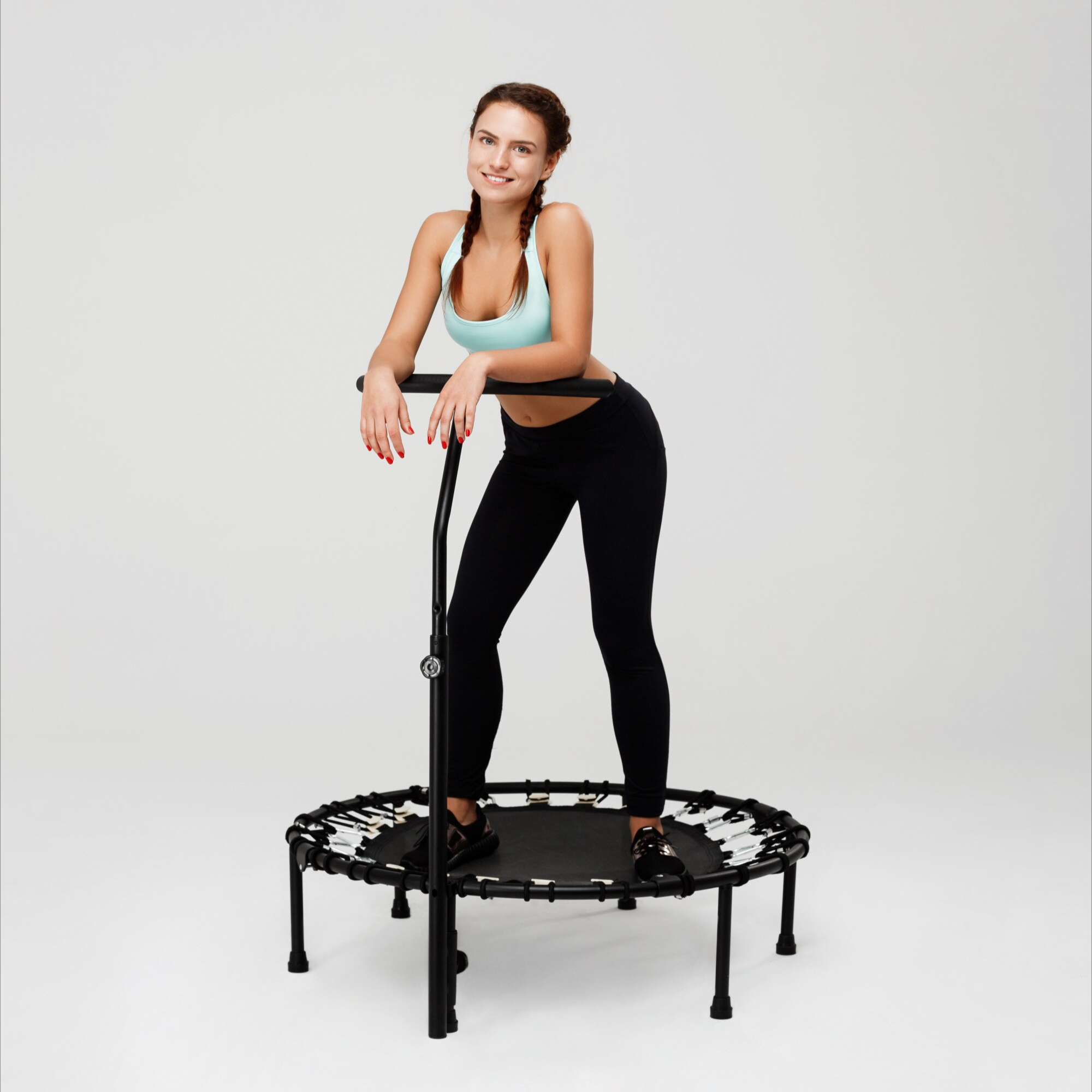 트램펄린은 재미있게 유산소 운동을 할 수 있는 도구로, 하체 근력 강화와 균형 감각 향상에 도움이 됩니다.