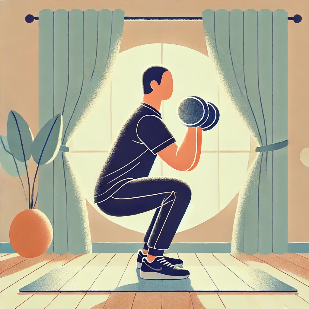 덤벨 하나를 가슴 앞에 들고 스쿼트하는 동작